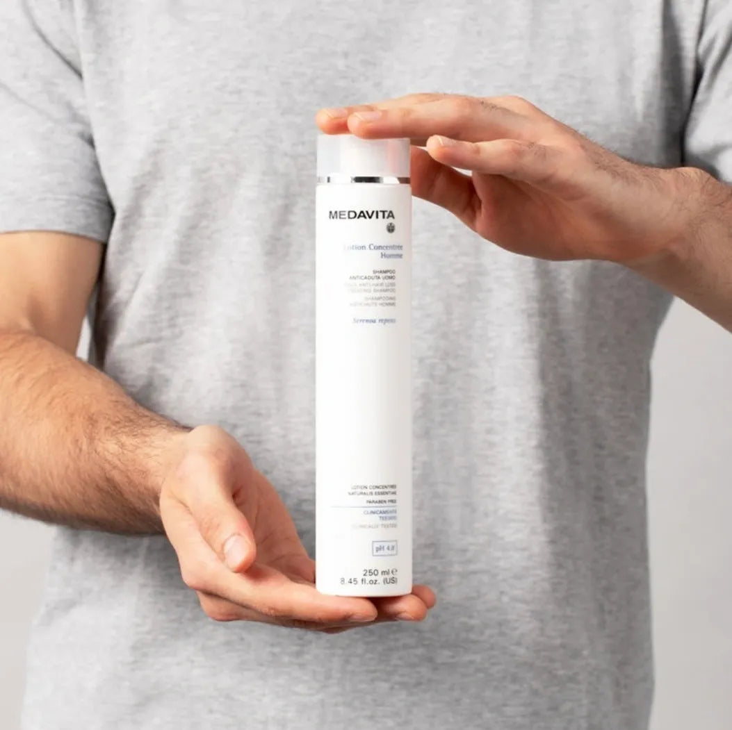 Découvrez le shampoing antichute "Lotion Concentrée" de Medavita, spécialement formulé pour les hommes. Ce shampoing nettoie en douceur le cuir chevelu et les cheveux, éliminant le sébum souvent associé à la chute des cheveux. Grâce à ses ingrédients actifs, il renforce et protège le cheveu, tout en stimulant sa croissance.