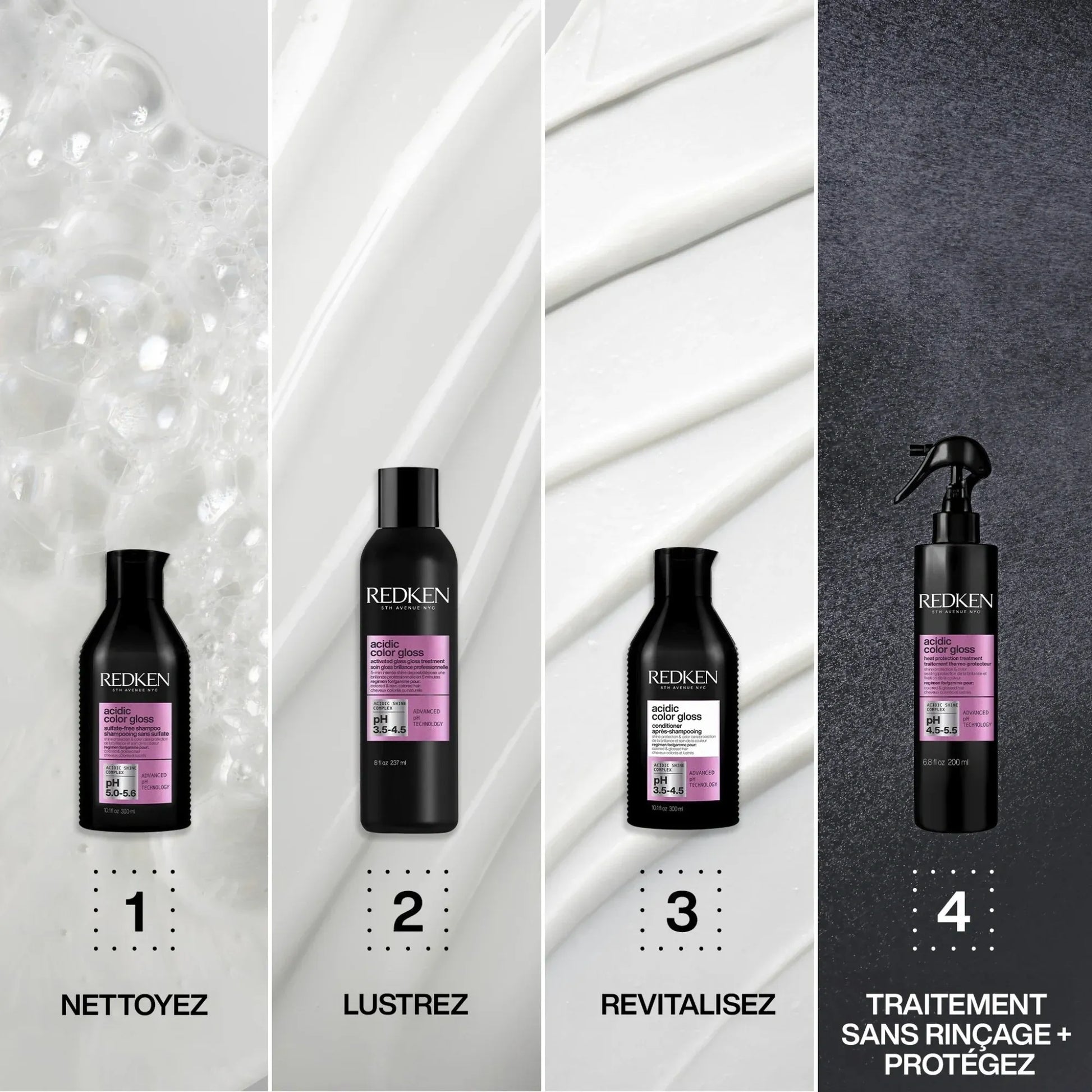 - Formule au pH acide qui scelle les cuticules et fixe la brillance.